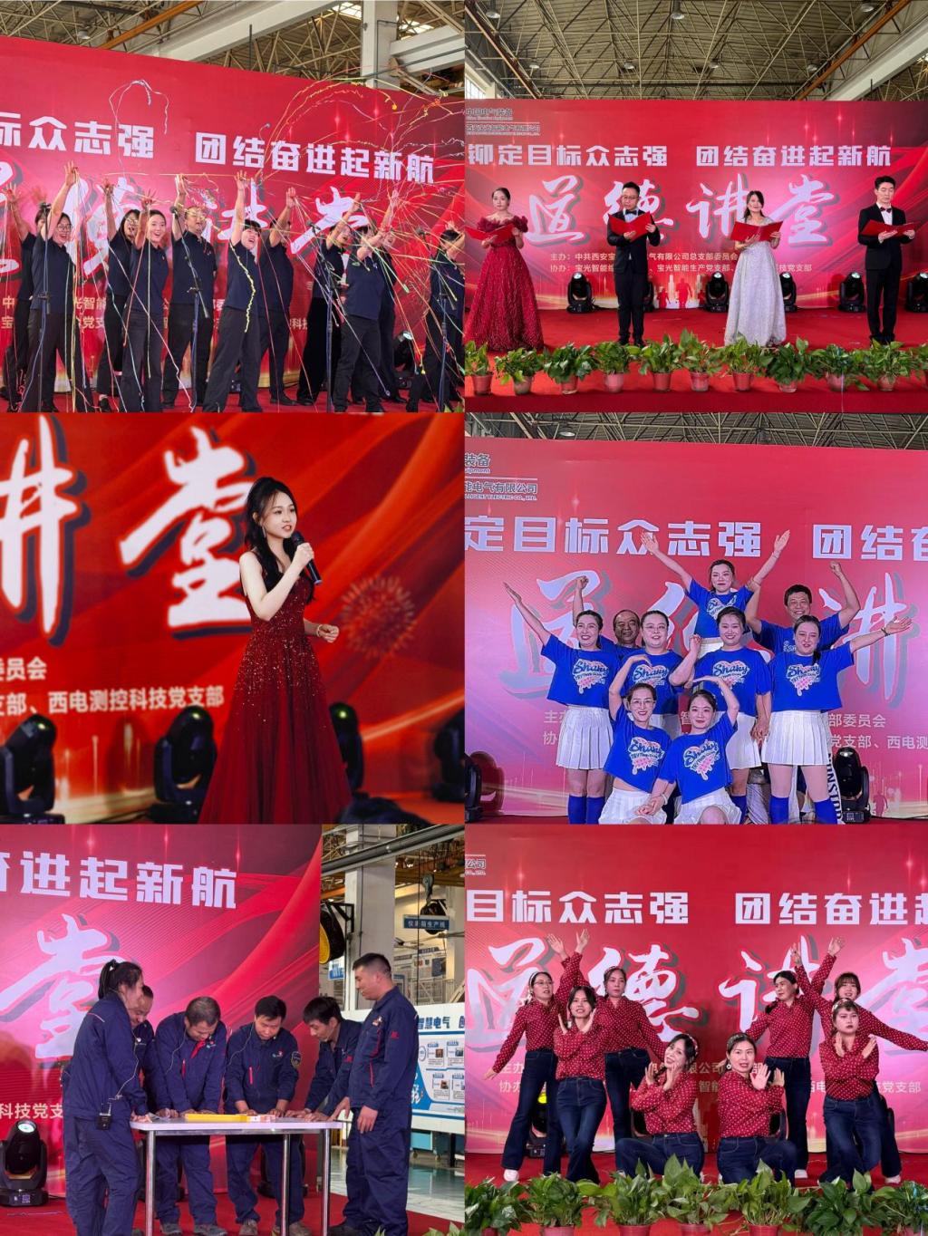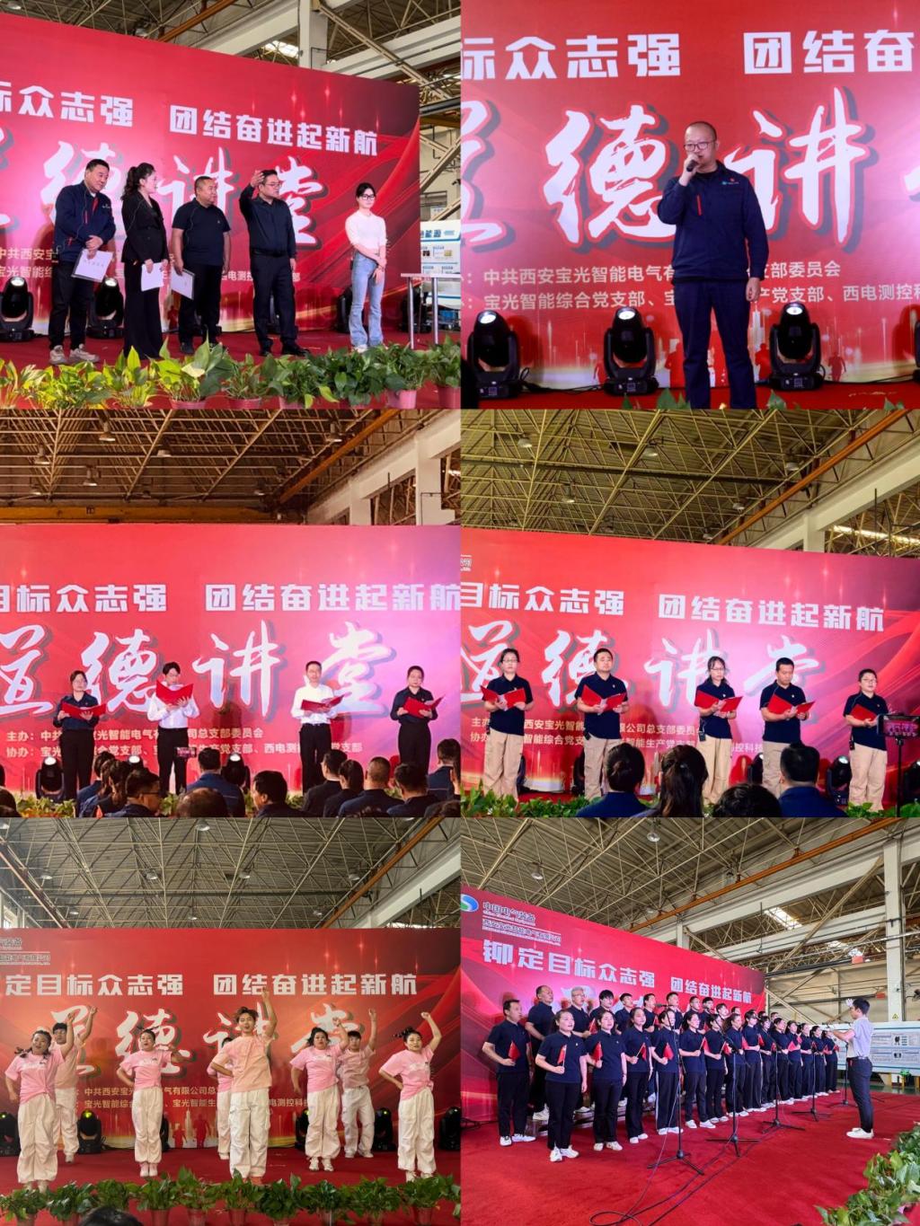 本次道德講堂圍繞唱歌曲、學模范、做承諾、誦經典、送祝福、做總結六個板塊展開,大家一起欣賞了開場合唱《明天會更好》、女聲獨唱《燈火里的中國》、西電測控獨唱《我和我的祖國》等歌曲;聆聽了展現企業發展歷程的《薪火相傳、共鑄榮光》、講述營銷處廉潔合規故事《道德的光芒》、表現庫房日常工作的《方寸間的信仰》等愛企愛國的感人誦讀;觀看了綜合辦根據清欠工作原創小品《清欠》、配套事業部班組協作小品《團結的力量》等反映基層一線的精彩故事;還有物流處、成套事業部、質檢處根據自身崗位特點編排的舞蹈《敬業陣線聯盟》、《我們都是追夢人》、手勢舞《勇往直前》等節目;期間寶光智能四位優秀黨員上臺做分享發言。營銷、生產、設計、物流的部門負責人在現場做出了廉潔承諾。