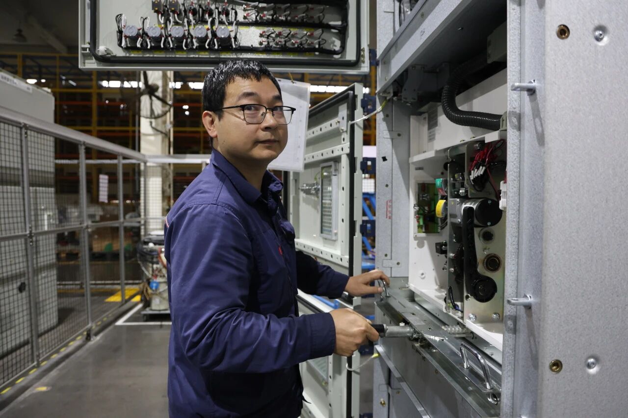 在創(chuàng)新方面,他善于在工作中總結(jié)經(jīng)驗(yàn)、優(yōu)化方法。近年來,他累計(jì)提出精益提案百余條,均被公司采納。當(dāng)被問及最自豪的事,他輕拍身旁的KYN61開關(guān)柜說道:“通過經(jīng)驗(yàn)積累,我改良了其后實(shí)心軸的裝配與端封板存放方式,使單臺開關(guān)柜裝配效率提升約30分鐘。”在班組中,他積極分享經(jīng)驗(yàn)、開展培訓(xùn),經(jīng)其悉心指導(dǎo),多名組員已能獨(dú)立完成從裝配、調(diào)試到問題處理及收尾的全流程工作。